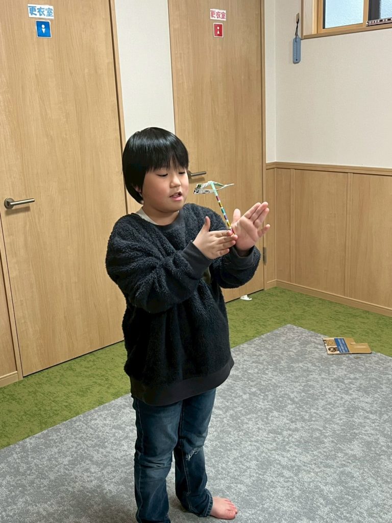 完成後は、実際に飛ばして遊びました。高く飛んだり、くるくる回ったりと、飛び方の違いを楽しみながら、何度も挑戦する様子が見られ、笑顔いっぱいの活動となりました。