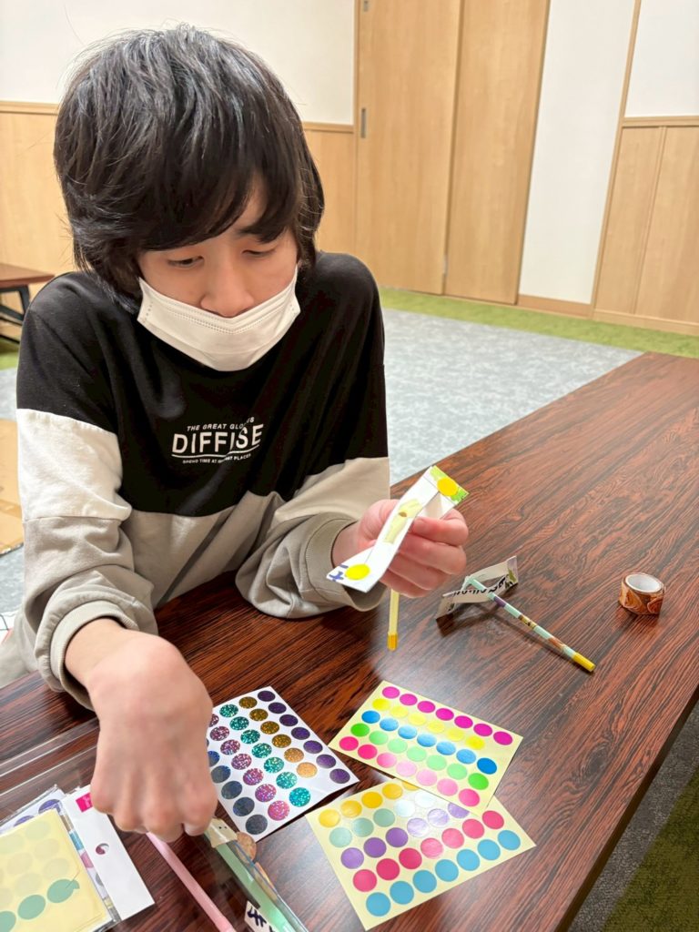 また、仕上げにシールやペンを使ってデコレーションも行い、オリジナルのかみとんぼが完成しました。