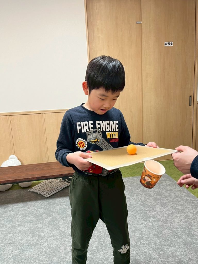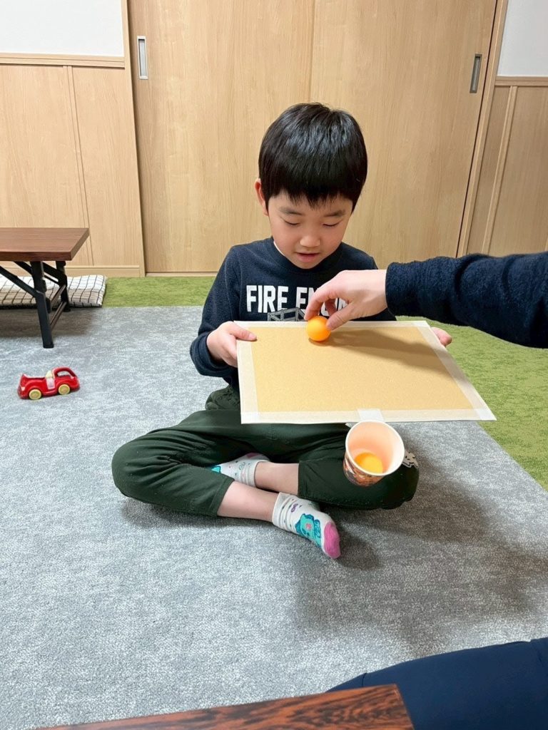 段ボールの板の中央に紙コップを取り付けたものを用意し、ピンポン玉を落とさせずに入れるというものです。まっすぐに見える板ですが、手で持ってみると思った以上にバランス保持が難しく大苦戦💦💦